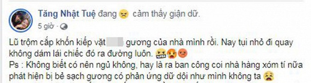 Vừa mới đây, ca sĩ- nhạc sĩ Tăng Nhật Tuệ thể hiện sự bức xúc vì bị “vặt gương” xe ô tô trên trang cá nhân. “Lũ trộm cắp khốn kiếp vặt gương của nhà mình rồi. Nay tụi nhỏ đi quay không dám lái chiếc đó ra đường luôn. Không biết có nên ngủ không, hay là ra ban công coi nhà hàng xóm tí nữa phát hiện bị bẻ sạch gương có phản ứng dữ dội như mình không ta”, Tăng Nhật Tuệ chia sẻ.