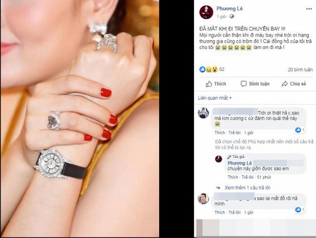 Xui xẻo ngày cuối năm còn phải kể đến hoa hậu Phương Lê. Người đẹp vừa tiết lộ mất chiếc đồng hồ đính kim cương dây mà màu đen. Được biết chiếc đồng hồ này có giá khoảng 1,6 tỉ đồng. “Đã mất khi đi trên chuyến bay! Mọi người cẩn thận khi đi máy bay nhé trời ơi hạng thương gia cũng có trộm đó! Cái đồng hồ của tôi trả cho tôi, làm ơn đi mà”, Phương Lê viết trên trang cá nhân.