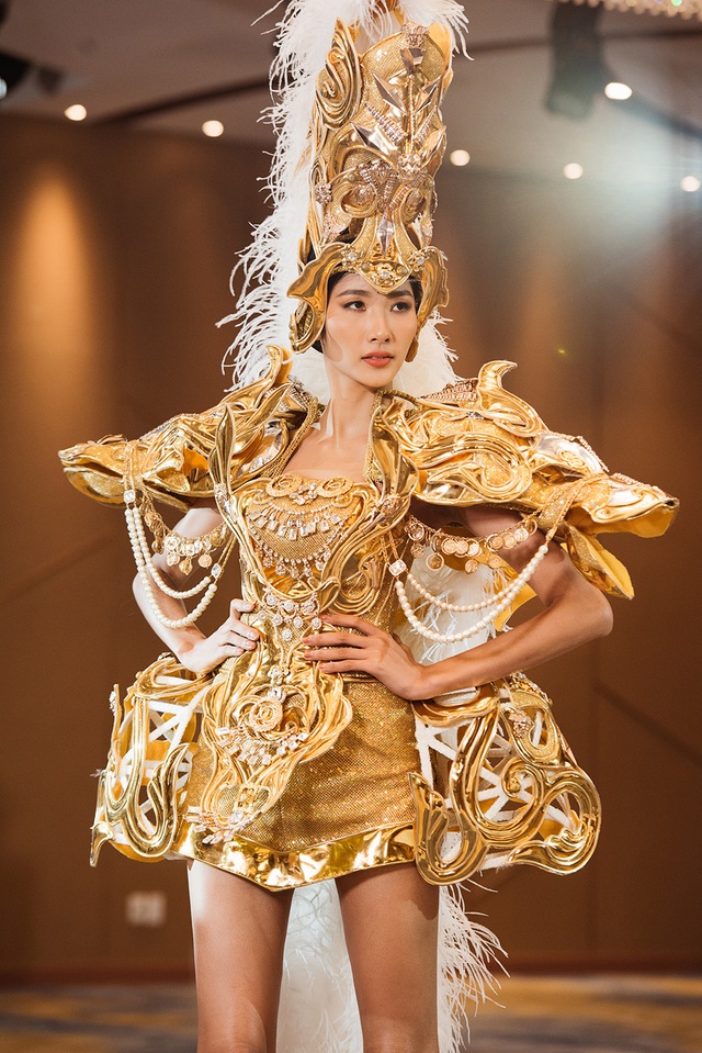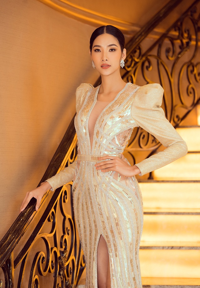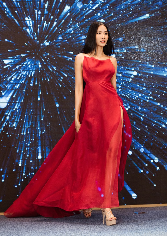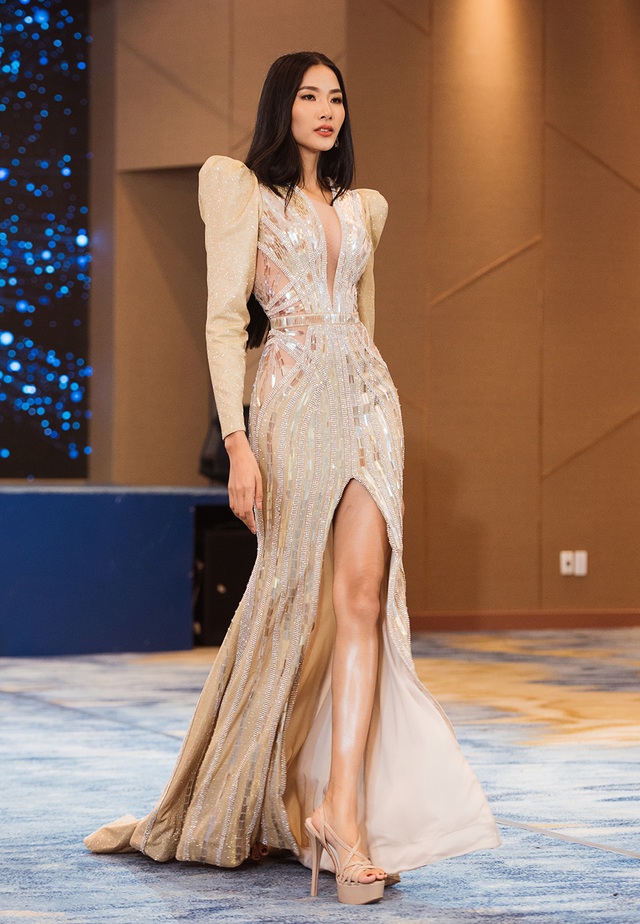 Trong phần catwalk với trang phục dạ hội, Hoàng Thùy được diện hai bộ trang phục với hai phong cách khác nhau: một bộ ôm sát khoe đường cong cơ thể và một bộ bay bổng để cô có thể thoải mái catwalk.