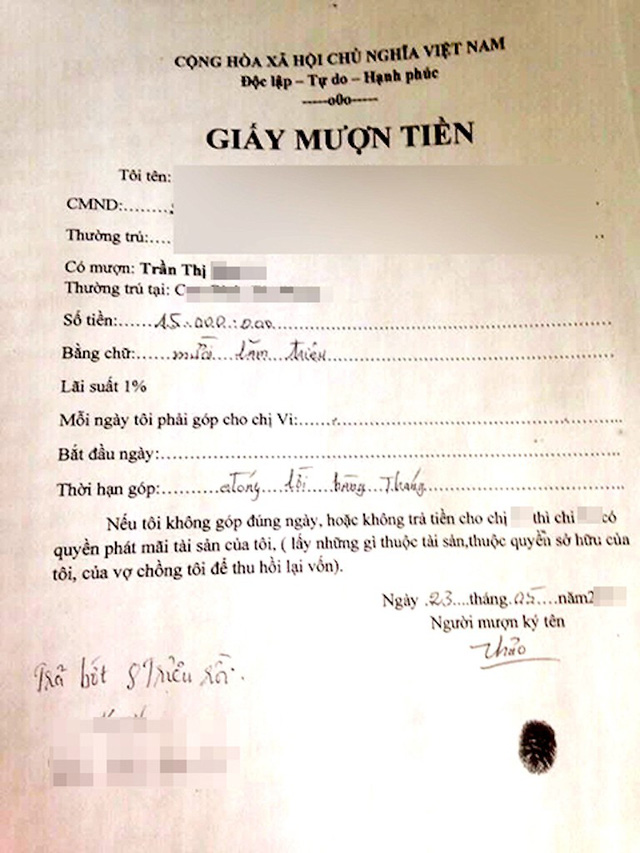 Sau cuộc gọi, anh H. được người đầu dây bên kia hướng dẫn đến địa chỉ tại đường Vườn Lài (quận Tân Phú) để làm thủ tục. Để vay được 20 triệu đồng, anh H. phải để lại CMND, bằng lái xe máy, địa chỉ nơi trọ, nơi làm việc và chụp ảnh sổ hộ khẩu ở quê. Lãi suất mà anh H. phải gánh là 21%/tháng (255%/năm)