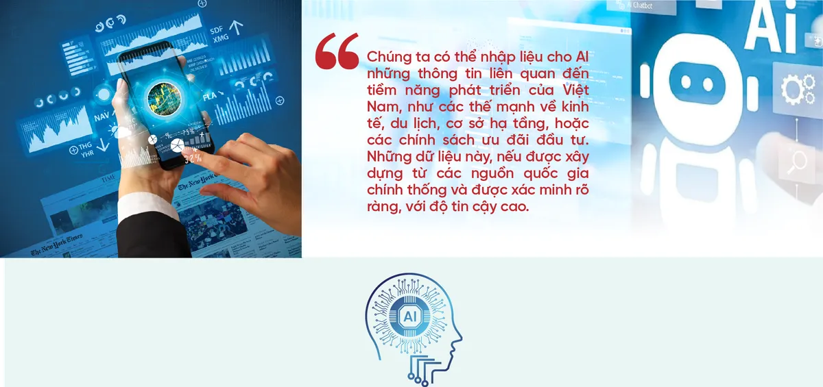 Chúng ta có thể nhập liệu cho AI những thông tin liên quan đến tiềm năng phát triển của Việt Nam, như các thế mạnh về kinh tế, du lịch, cơ sở hạ tầng, hoặc các chính sách ưu đãi đầu tư. Những dữ liệu này, nếu được xây dựng từ các nguồn quốc gia chính thống và được xác minh rõ ràng, với độ tin cậy cao.
