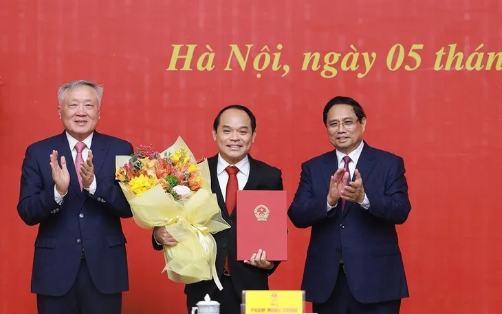 Thủ tướng Phạm Minh Chính và Phó Thủ tướng Thường trực Nguyễn Hoà Bình trao Quyết định bổ nhiệm Phó Tổng Thanh tra Thường trực Thanh tra Chính phủ đối với ông Nguyễn Quốc Đoàn. (Ảnh: TTXVN)