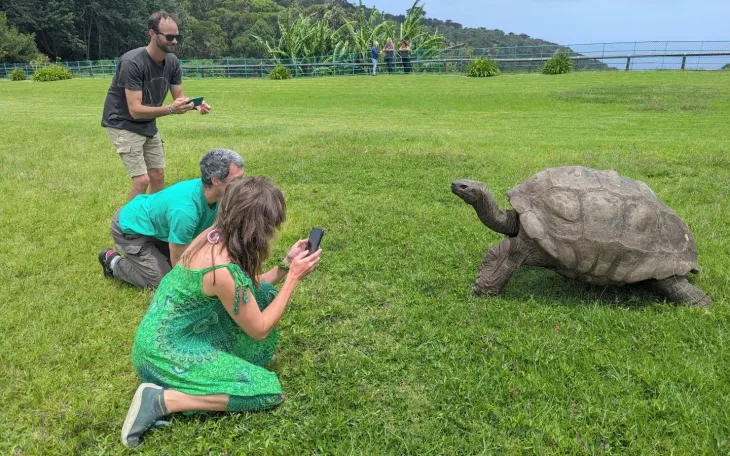 Du khách chụp ảnh rùa Jonathan tại đảo St. Helena, ngày 22/2/2024. (Ảnh: AP)