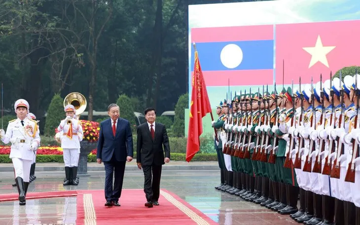 Tổng Bí thư Tô Lâm và Tổng Bí thư, Chủ tịch nước Lào Thongloun Sisoulith duyệt Đội danh dự Quân đội nhân dân Việt Nam. (Ảnh: TTXVN)