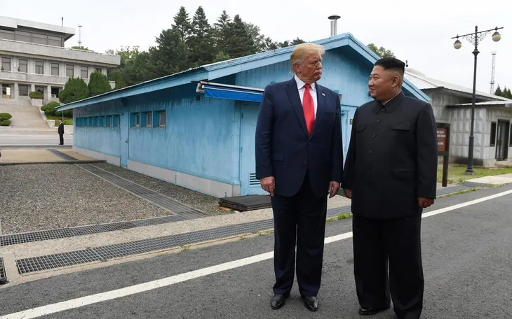Tổng thống Mỹ Donald Trump (bên trái) gặp nhà lãnh đạo Triều Tiên Kim Jong-un tại làng biên giới Panmunjeom ở Khu phi quân sự, Hàn Quốc, ngày 30/6/2019 (Ảnh: AP/Yonhap)