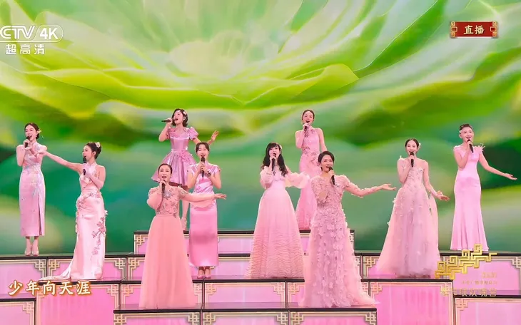 Trang phục của các người đẹp đều cùng màu hồng phấn nhẹ nhàng, thanh lịch. Họ cùng nhau hòa giọng trong ca khúc Lập xuân, mang lại không khí vui tươi, ấm áp cho ngày đầu năm mới. Hy Lâm Na Y Cao tiết lộ, mỗi nghệ sĩ mặc một bộ trang phục được thiết kế riêng gắn liền với một loài hoa, cùng các họa tiết, phụ kiện lấy cảm hứng từ các yếu tố di sản văn hóa phi vật thể. Những bộ váy hồng tưởng như đơn giản thực chất được chăm chút bằng hoa văn truyền thống, gửi gắm thông điệp bảo tồn văn hóa qua nghệ thuật trình diễn.