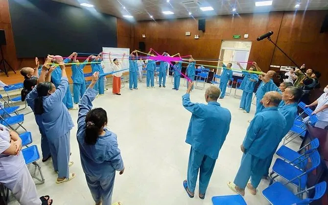 Tại hội trường tầng 5 của bệnh viện, hơn 20 bệnh nhân từ 60 tuổi trở lên đã cùng nhân viên y tế tham gia các bài tập nhẹ nhàng theo nhạc. Các động tác tập trung vào hơi thở và vận động cơ thể đã tạo nên không gian kết nối Thân - Tâm - Trí đầy cảm xúc.