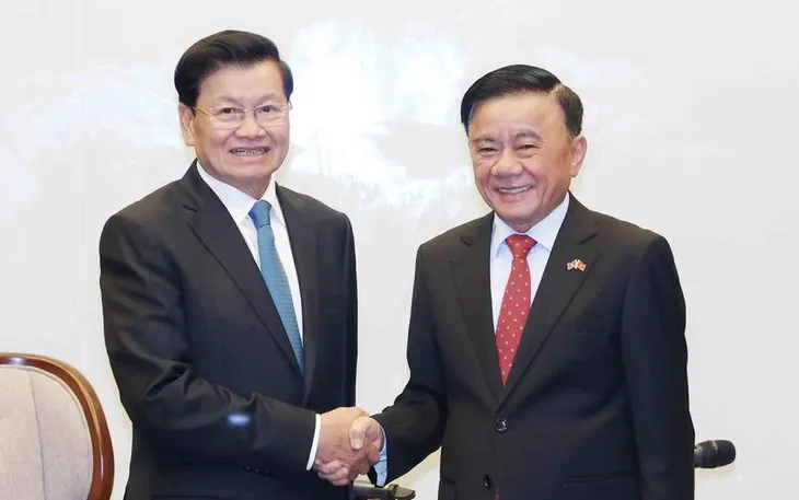 Thường trực Ban Bí thư Trần Cẩm Tú với Tổng Bí thư, Chủ tịch nước Lào Thongloun Sisoulith. (Ảnh: TTXVN)