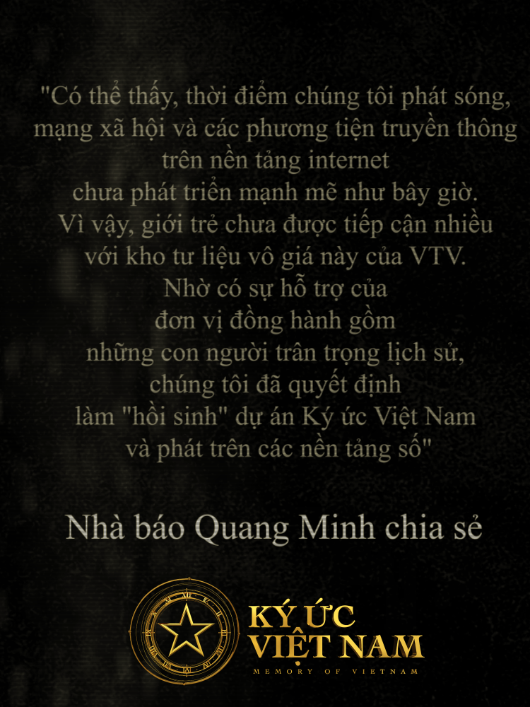 "Mong muốn của chúng tôi là buổi tối, sau một ngày bận rộn, sau ngập tràn những thông tin mà bạn tiếp nhận trong ngày, bạn lướt mạng không phải để tìm đến những thông tin xấu độc hay giải trí đơn thuần, Ký ức Việt Nam sẽ giúp bạn có 2,3 phút lắng đọng và miên man theo chiều dài lịch sử để biết trân trọng hơn những gì mà chúng ta đang có ngày hôm nay. Nhân đây chúng tôi cũng xin được cảm ơn Novaland với tư cách là đơn vị đồng hành đã cùng ê kíp sản xuất nội dung số của Đài THVN làm hồi sinh dự án Ký ức Việt Nam để phục vụ các bạn trẻ trên môi trường Internet", Nhà báo Lê Quang Minh - Giám đốc Trung tâm tin tức VTV24, Chủ tịch Hội đồng tin tức số, Đài truyền hình Việt Nam nhấn mạnh.