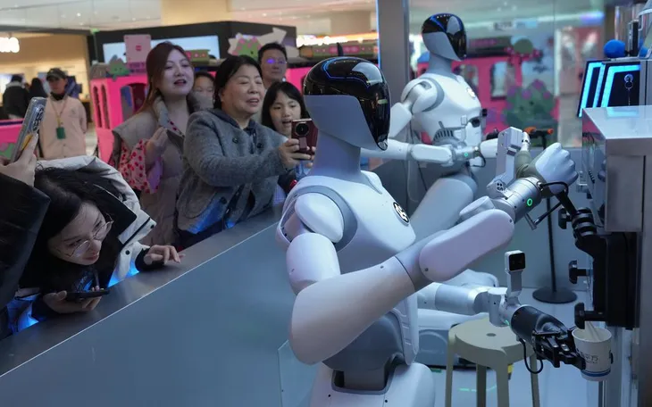 Người mua sắm quan sát robot hình người phục vụ kem và cà phê tại một gian hàng trong trung tâm thương mại ở Beijing, Trung Quốc, ngày 28/2/2026. (Ảnh: AP/Andy Wong)