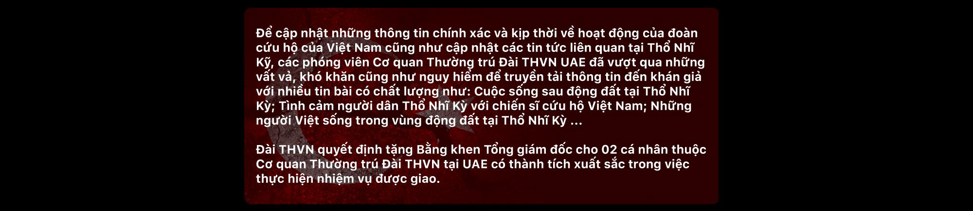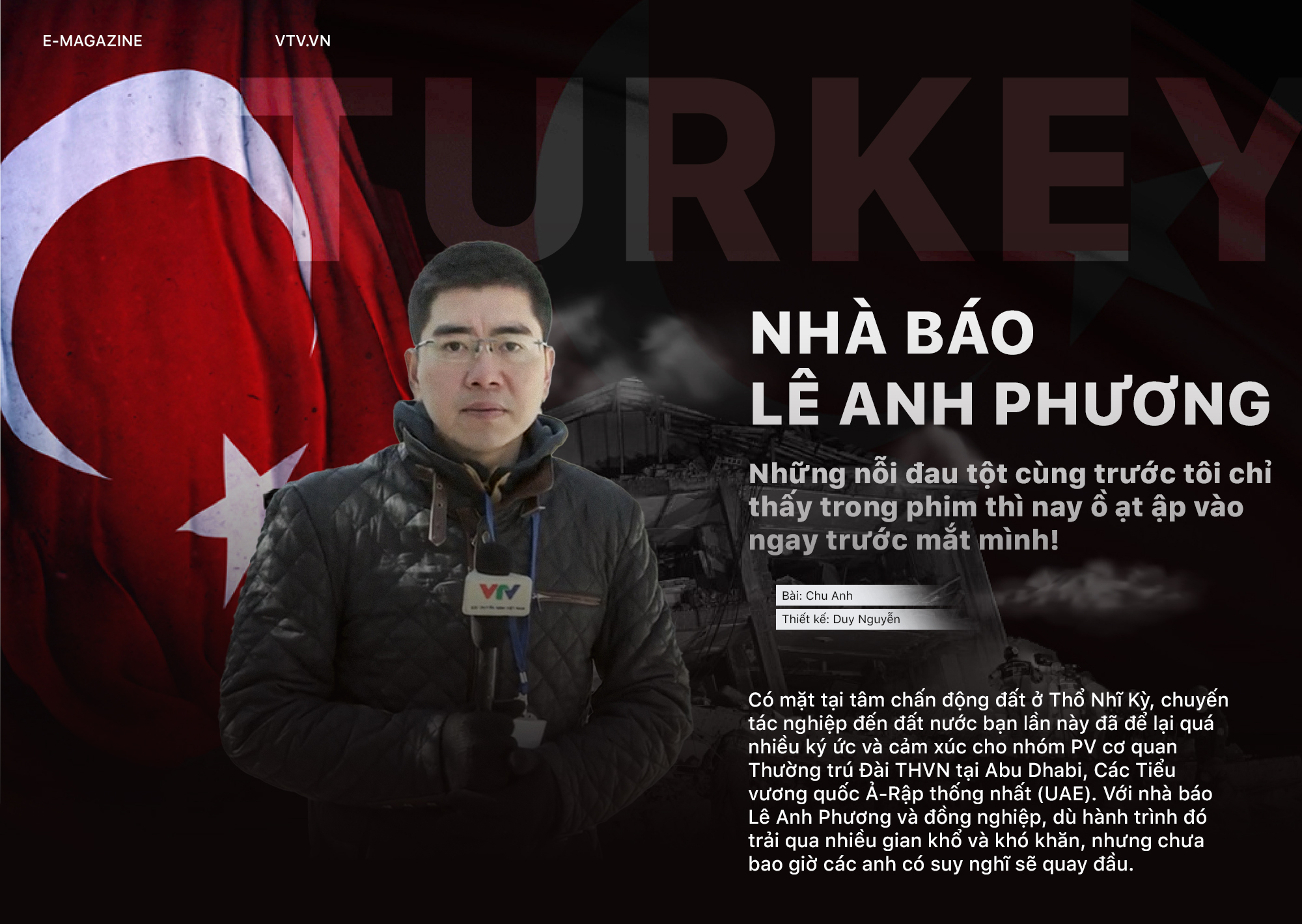 Một tuần sau thảm họa kinh hoàng chấn động cả Thế giới, vào ngày 13/2/2023, Việt Nam đã cử đoàn công tác sang Thổ Nhĩ Kỳ để tham gia vào chiến dịch cứu hộ, cứu nạn giải cứu các nạn nhân đang bị vùi lấp ở các tòa nhà trong trận động đất, khắc phục hậu quả nặng nề sau thiên tai. Song song với thời điểm đó, nhà báo Lê Anh Phương - Trưởng Cơ quan Thường trú Đài THVN tại Abu Dhabi, Các Tiểu vương quốc Ả-Rập thống nhất (UAE) cùng với quay phim Nguyễn Tuấn cũng đã ngay lập tức nhận nhiệm vụ lên đường sang điểm nóng. Nhóm phóng viên Đài THVN thường trú tại UAE đã đồng hành cùng với đoàn công tác, cập nhật kịp thời và chính xác tin tức, đưa được những hình ảnh từ nơi tâm chấn động đất đến với khán giả.