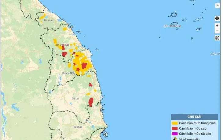 Tại thành phố Đà Nẵng, các xã, phường có nguy cơ xảy ra lũ quét, sạt lở đất gồm: Hiệp Đức, Phước Hiệp, Phước Trà, Trà Leng; Bà Nà, Bến Giằng, Khâm Đức, Phú Ninh, Sơn Cẩm Hà, Tây Hồ, Tiên Phước, Trà Giáp, Trà My.