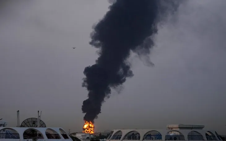 Lửa bùng lên sau khi một máy bay không người lái va chạm với bồn chứa nhiên liệu, khiến Sân bay Quốc tế Dubai phải tạm ngừng hoạt động, ngày 16/3/2026. (Ảnh: AP)