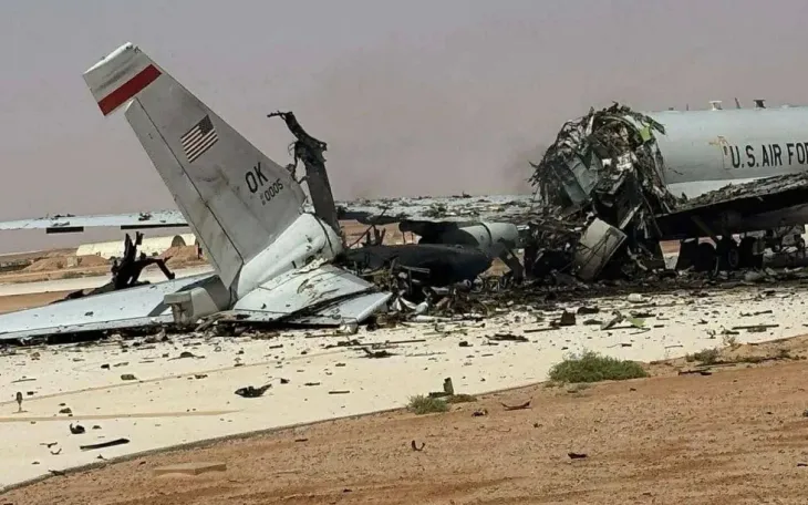 Hình ảnh được cho là chiếc E-3 Mỹ bị phá hủy sau đòn tấn công của Iran hôm 26/3/2026. (Ảnh: Snco)