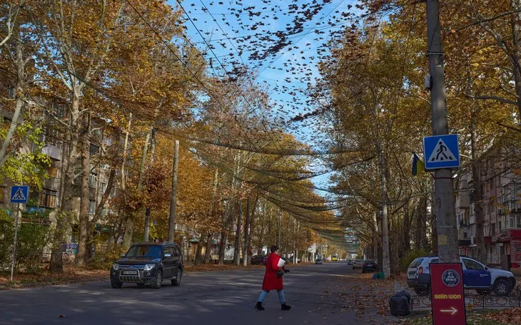 Người dân băng qua đường được phủ lưới chống máy bay không người lái FPV tại thành phố tiền tuyến Kherson, miền Nam Ukraine, ngày 3/11/2025 (Ảnh: AP)