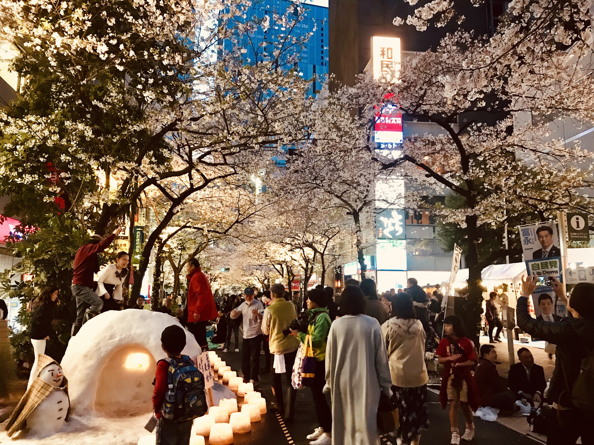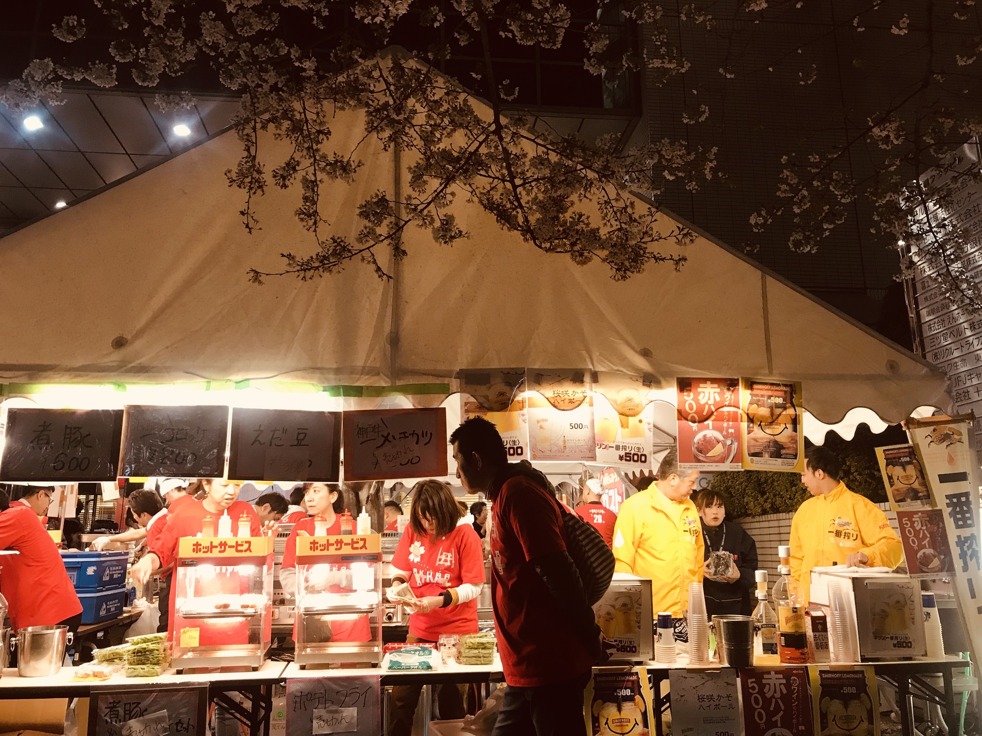 Dễ nhận ra nhất là mùi thơm hấp dẫn của đặc sản vỉa hè ra từ những quán dựng tạm phục vụ lễ hội. Tuy là mòn ăn "vỉa hè" nhưng các món như gà nướng (yakitori), bánh bạch tuộc nướng (takoyaki) bia, trà ngâm nước đá đều rất ngon, đảm bảo vệ sinh và hợp túi tiền. Bạn có thể tìm một chỗ dưới lòng đường để trải bạt ngồi vừa xem ban nhạc chơi nhạc sống vừa thưởng thức hoa Anh đào. Ngoài ra nếu bạn đi cùng gia đình có trẻ em thì trải nghiệm cầu trượt bằng băng hay đắp người tuyết nhất định sẽ làm cho các bạn nhỏ thích thú.