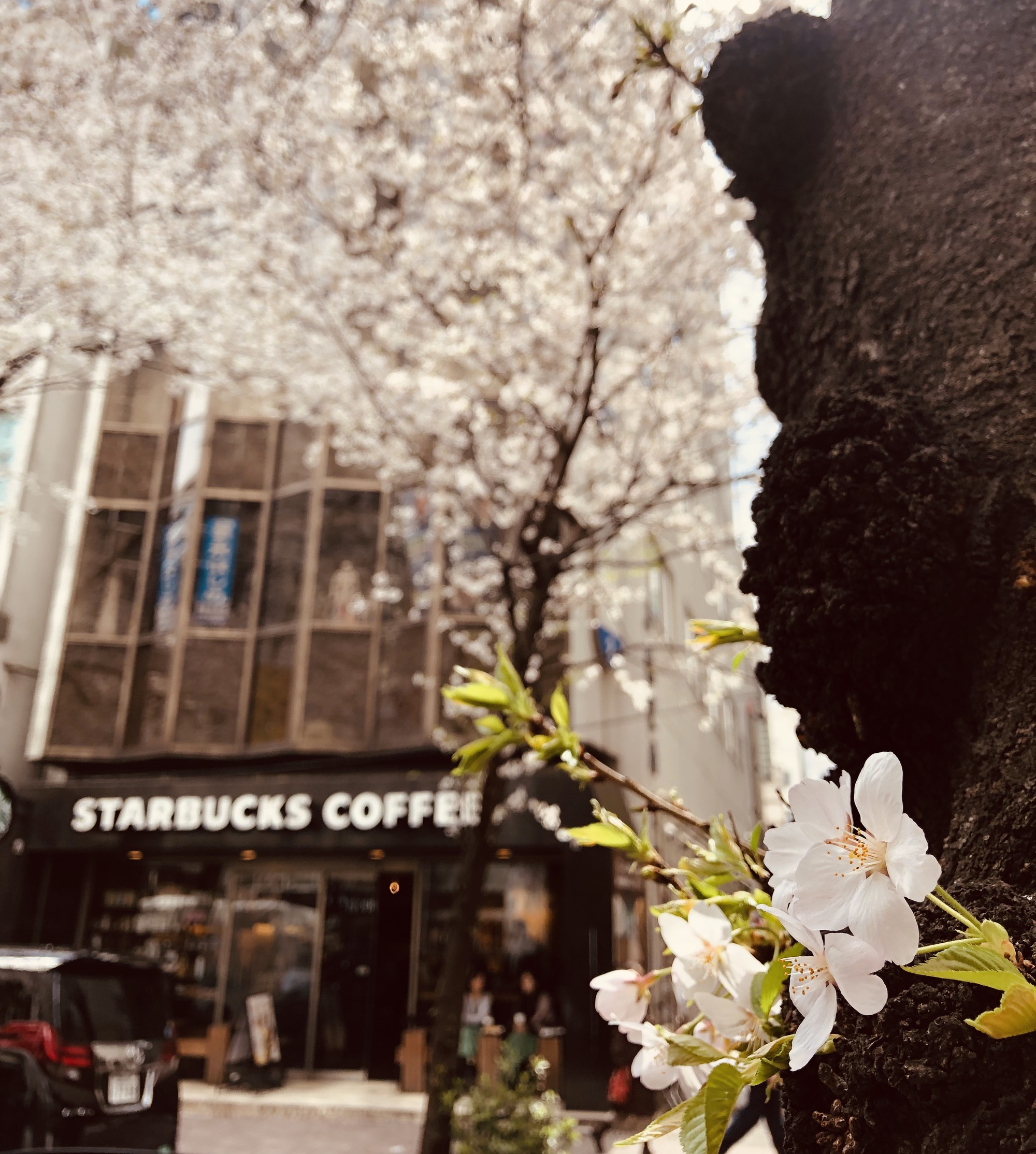 Trước cửa hàng Stabucks trên phố Sakura-dori có một hàng ghế gỗ để bạn có thể vừa nhâm nhi cà phê vừa ngắm hoa Anh đào. Thời tiết vào đầu xuân ở Tokyo vẫn còn khá lạnh. Nhiệt độ trung bình dao động trong khoảng 5 tới 15 độ C. Vào ngày lạnh, hàng ghế sau cửa kính ấm cúng sẽ là một chỗ ngồi lý tưởng. Tuy nhiên bạn phải là người rất may mắn bởi đó luôn là hàng ghế hết chỗ đầu tiên.