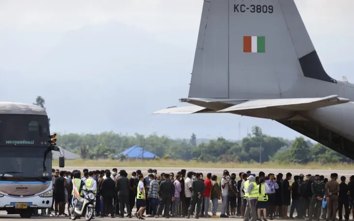 Công dân Ấn Độ bị nghi từng làm việc tại các trung tâm lừa đảo ở Myanmar lên máy bay hồi hương từ Thái Lan, ngày 6/11/2025 (Ảnh: AP)