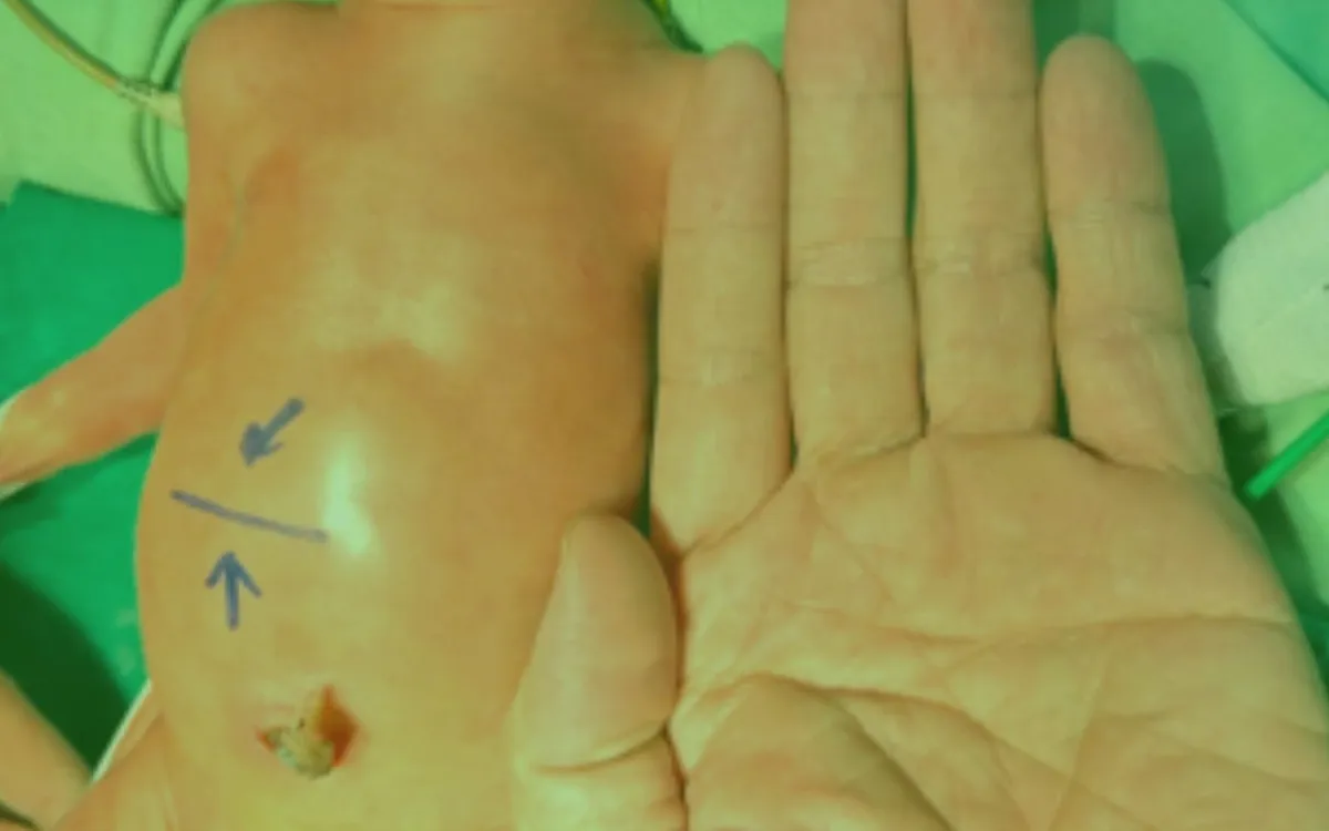 Bệnh nhi là song thai thứ hai, sinh mổ ở 31 tuần 4 ngày do suy thai, cân nặng lúc sinh 950 gram. Sau sinh, trẻ được theo dõi tại một bệnh viện sản tại TP Hồ Chí Minh trong tình trạng thở nhanh.