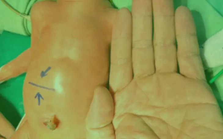 Tại Khoa Cấp cứu, bệnh nhi trong tình trạng nặng, bụng trướng căng ảnh hưởng hô hấp, phải thở máy, thông dạ dày ra nhiều dịch xanh. Trước diễn tiến nguy kịch, ca bệnh được hội chẩn khẩn với ngoại nhi và thống nhất chỉ định phẫu thuật cấp cứu nhằm tránh nguy cơ thủng ruột, nhiễm trùng huyết và suy đa cơ quan.