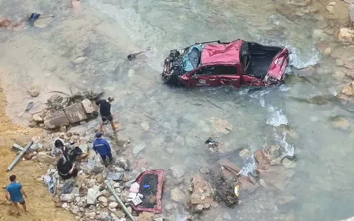 Cú tông mạnh khiến xe bán tải bị hất qua lan can và rơi xuống dòng suối bên dưới. Phương tiện bị biến dạng nặng.