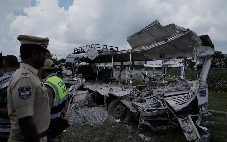Hiện trường vụ xe tải đâm xe bus ở miền Nam Ấn Độ (Ảnh: AP)