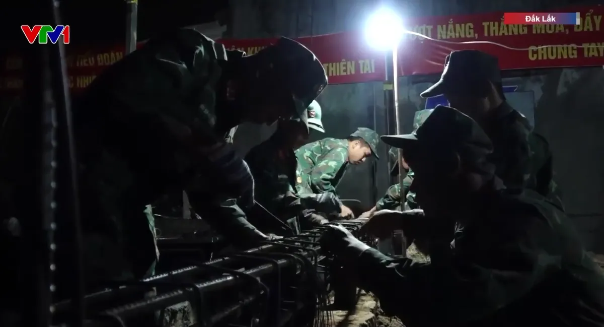 Hiện ở khu vực phía đông tỉnh Đắk Lắk, trời vẫn đang có mưa. Điều này gây khó khăn không ít trong công tác thi công. Do vậy, để không ảnh hưởng đến tiến độ, ngoài làm ngày, các lực lượng tổ chức làm đêm. Trong đêm tĩnh lặng, khi người dân đã ngủ, các chiến sĩ này vẫn đang xây nhà.