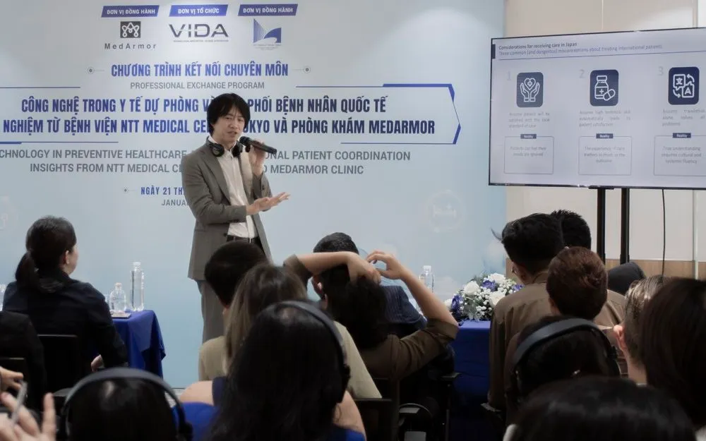 Các chuyên gia y tế Nhật Bản và Việt Nam vừa cùng thảo luận về tương lai của y tế dự phòng và điều phối chăm sóc sức khỏe xuyên biên giới tại hội thảo "Công nghệ trong y tế dự phòng và điều phối bệnh nhân quốc tế - Góc nhìn từ NTT Medical Center Tokyo và Phòng khám MedArmor". Sự kiện do Viện Phát triển và Ứng dụng Công nghệ Số (VIDA) tổ chức tại TP Hồ Chí Minh.